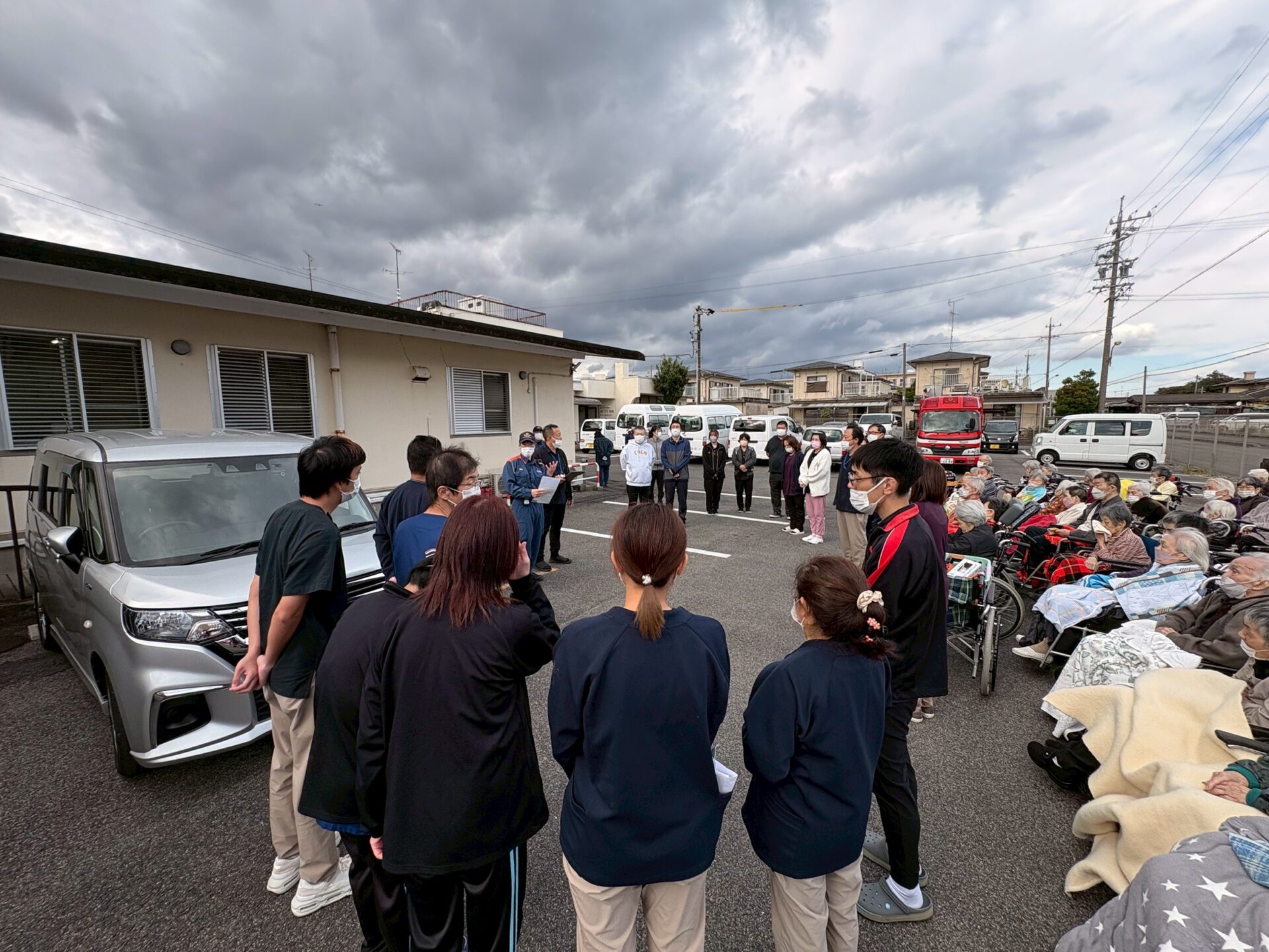 職員が初期対応から避難誘導までの流れを確認し、利用者様の安全を最優先に行動できるよう訓練を行いました。