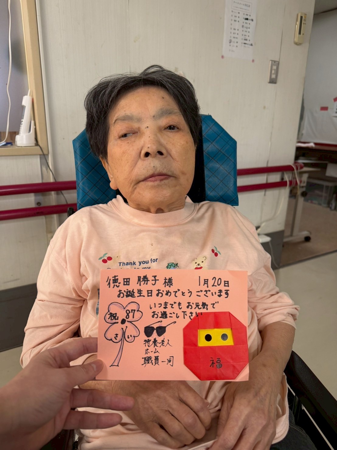 1月生まれの利用者さまのお誕生日会を開催しました。 施設長からもお祝いの、言葉あり終始あたたかな雰囲気の中で、笑顔あふれるひとときをすごされました。