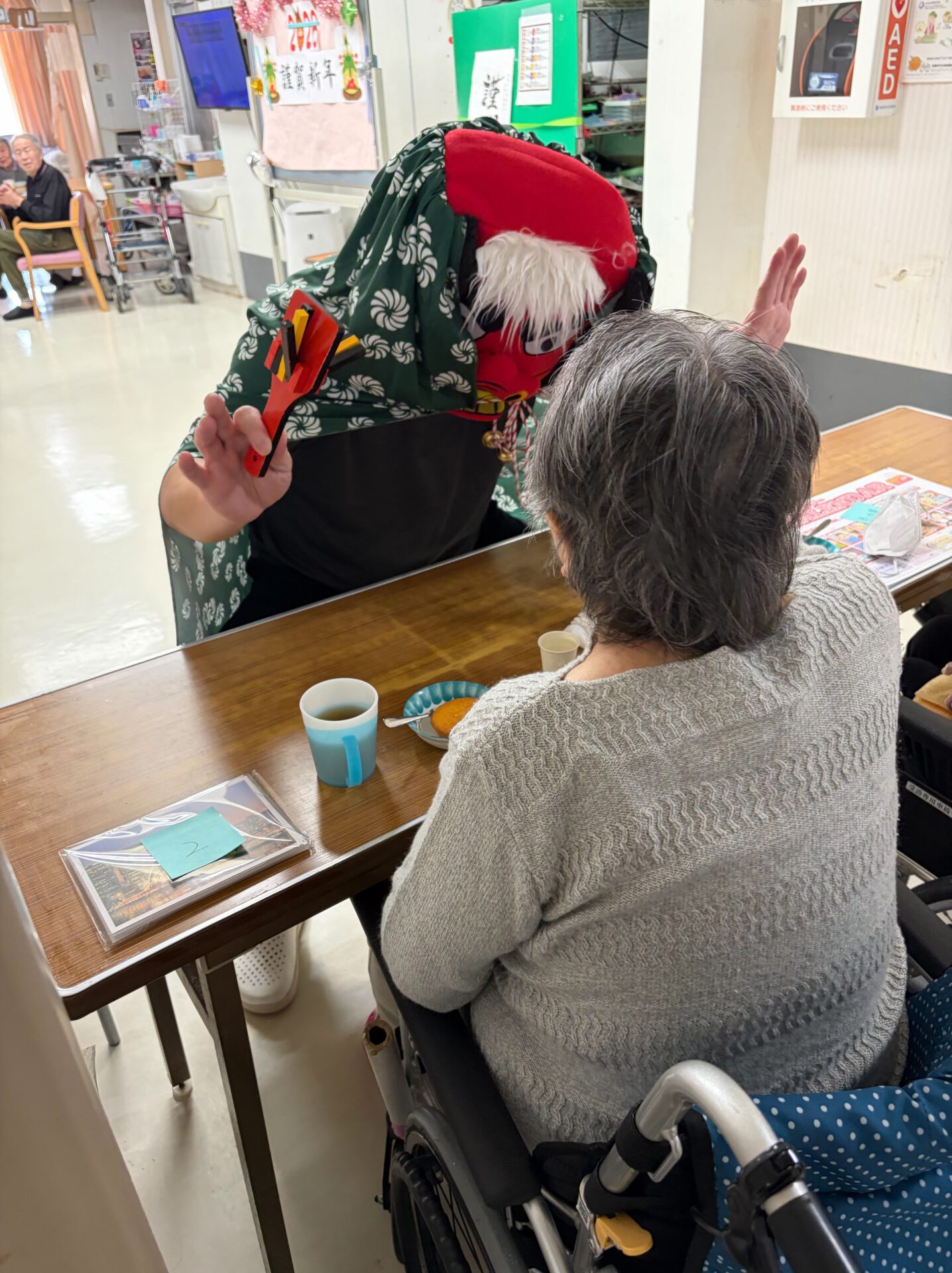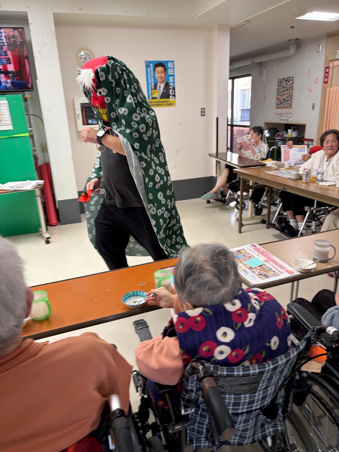 獅子舞は、なんと!職員が大変身!! 「無病息災」「健康長寿」の願いを込めて獅子舞が近づくと 笑顔 拍手 歓声 が、あふれていました!