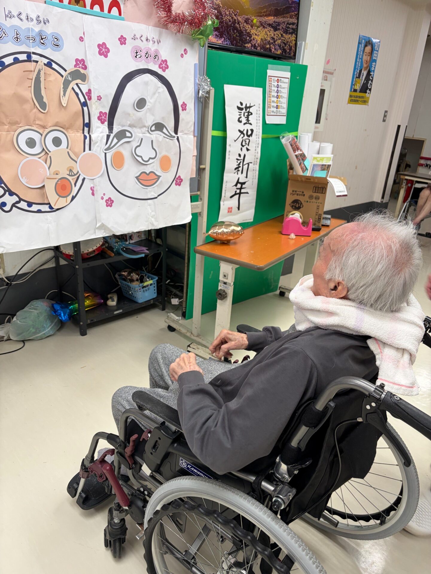 新年を迎え、施設では獅子舞、福笑いを行いました。