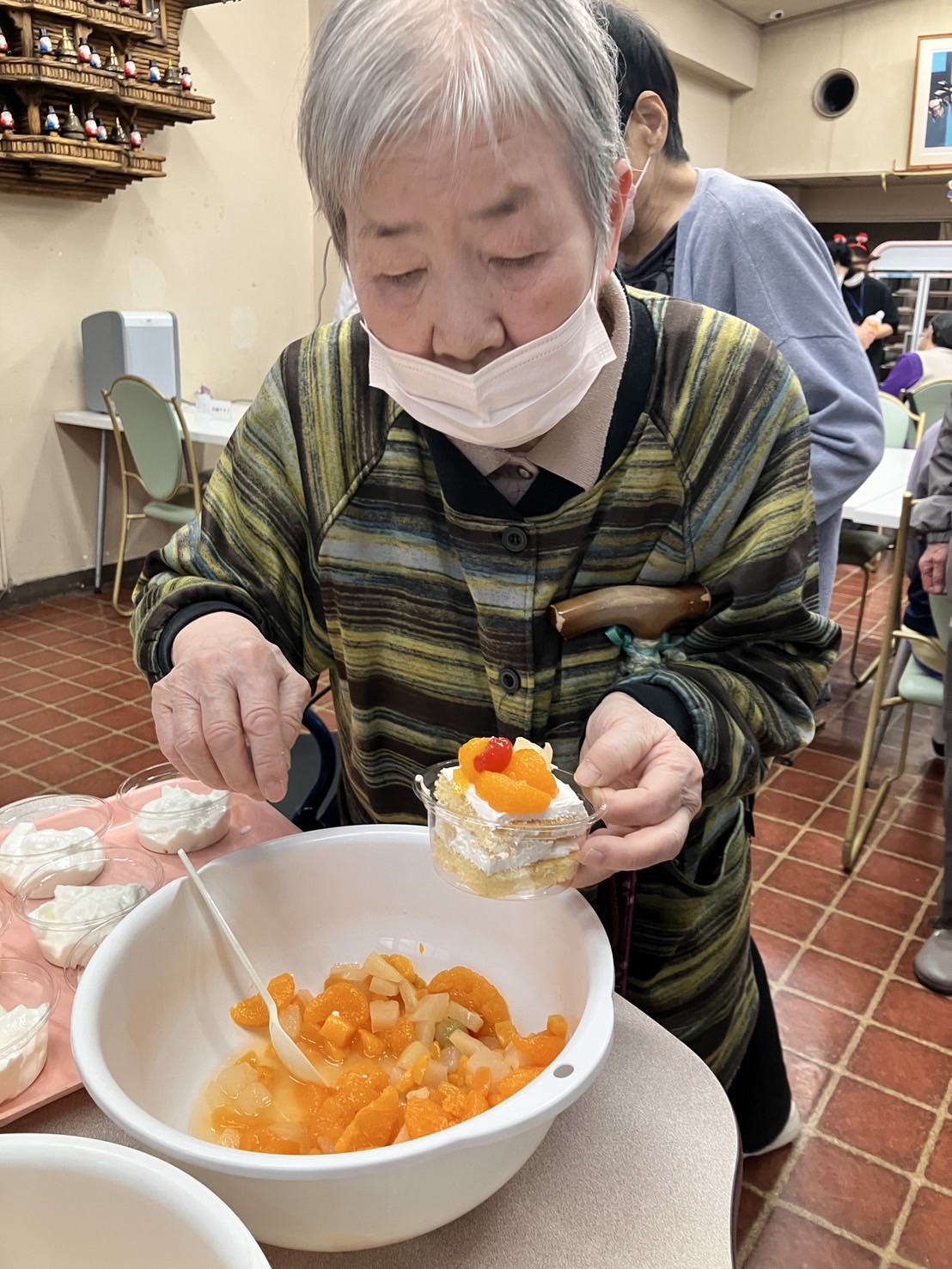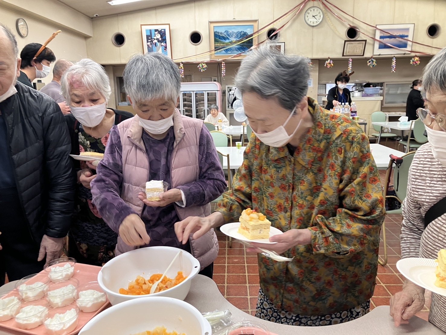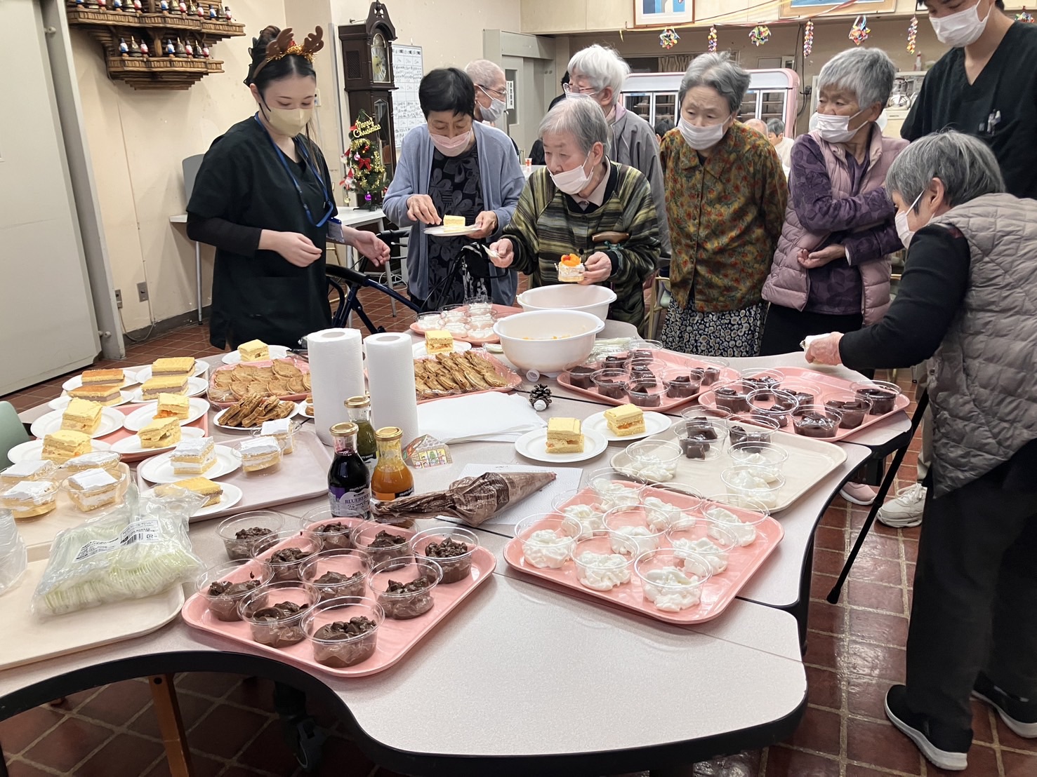 12月25日、当養護老人ホームにて、クリスマス会を開催いたしました。 今年のクリスマス会では、皆さまに楽しんでいただけるよう「デザートバイキング」を企 画し、ケーキや羊羹、たい焼きなど、さまざまな甘味をご用意しました。